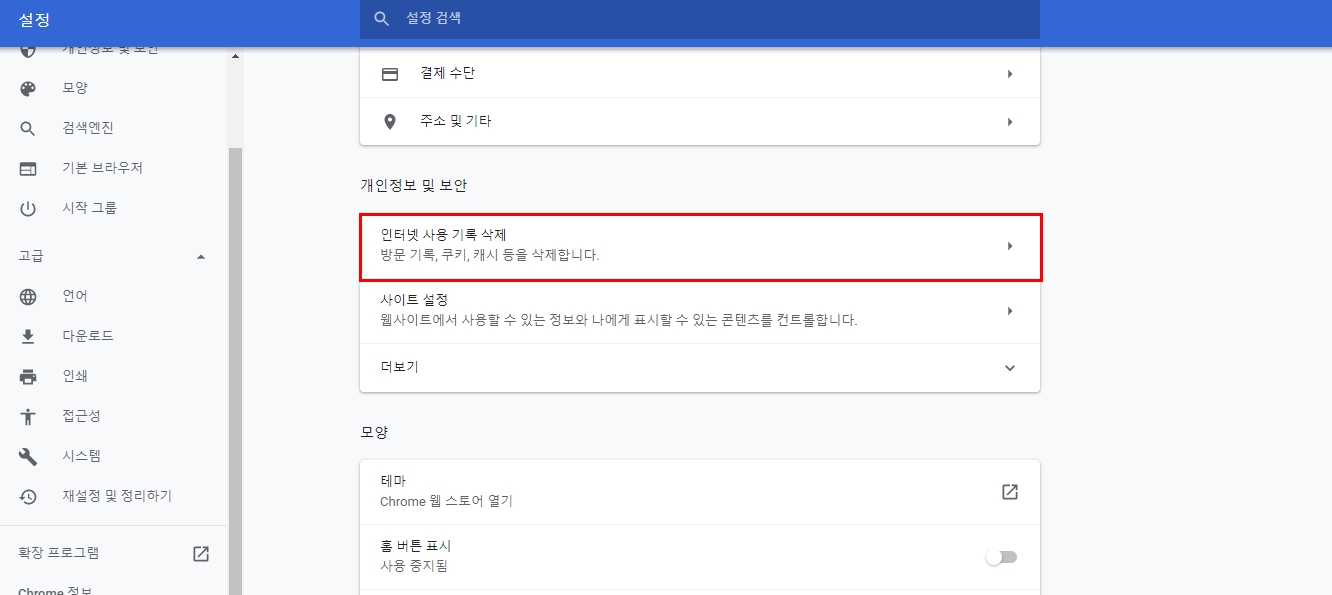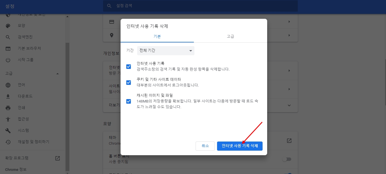 그리고 인터넷 사용 기록 삭제(쿠키 삭제)