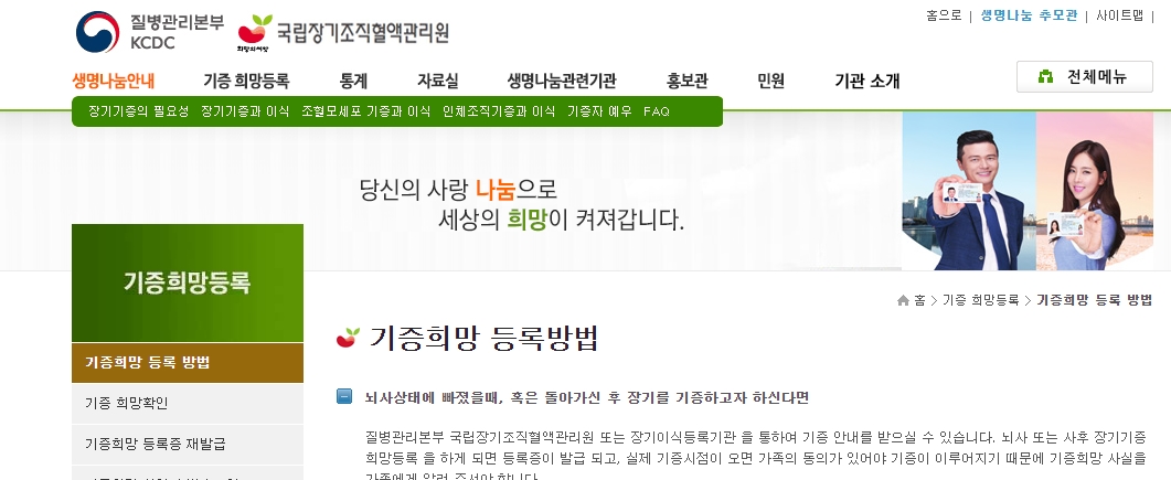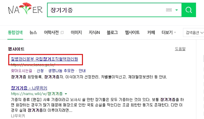 네이버에 장기기증이란 키워드로 검색하면 첫번째 검색결과가 질병관리본부 입니다