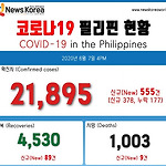 ◎ 필리핀 6월 7일 코로나19 상황 ◇ 확진자(Comfirmed) : 21,895 (+555 (신규 +378, 누락 +177)) ◇ 사망자(Deaths) : 1,003 (+9) ◇ 완치자(Recoveries) : 4,530 (+89) 출처 : 뉴스코리아 필리핀(http://www.newskoreaworld.com)